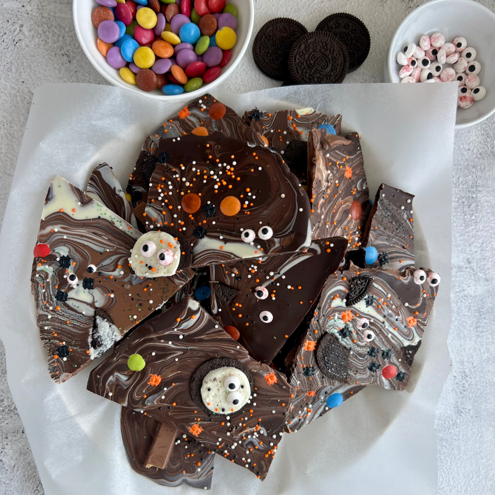 - Top the bark with broken Oreo's, KitKat, Smarties, Candy eyes and a mix of the sprinkles