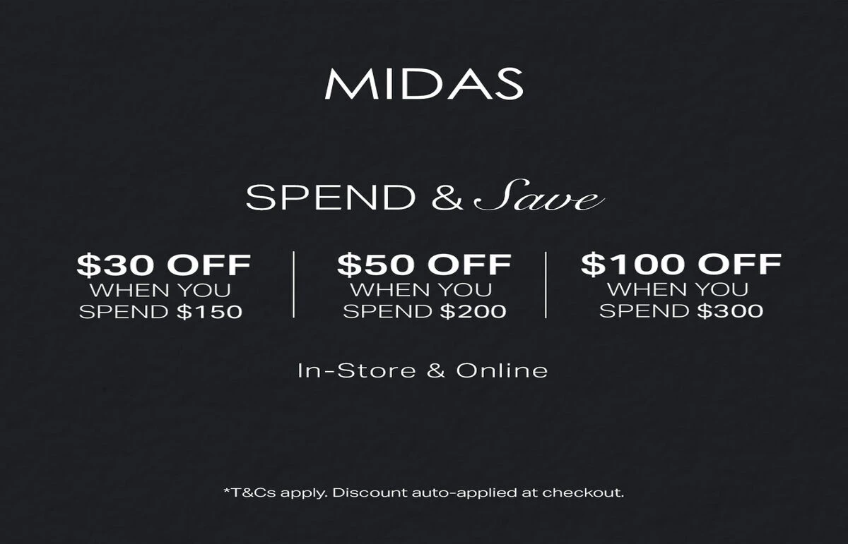 Spend & Save Home ... Offers Spend & Save $30 Off When You Spend $150 $50 Off When You Spend $200 $100 Off When Your Spend $300 Terms and Conditions apply. See in store for more details. Details Valid until: 15 Apr 2026 Midas Shoes , Located on G (08) 6478 1123